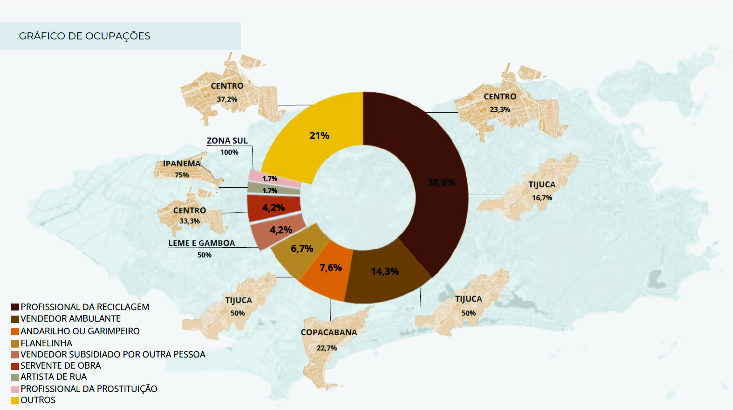 De forma sintética, no período de desenvolvimento dessa pesquisa, as atividades com maior atuação foram: profissional da reciclagem (38,6%), vendedor ambulante (14,3%), andarilho ou garimpeiro – sem atividade laboral definida (7,6%), flanelinha (6,7%), vendedor subsidiado por outra pessoa (4,2%), servente de obra (4,2%), artista de rua (1,7%), profissional da prostituição (1,7%). Os demais 21% indicaram “nenhuma atividade” ou apenas se associaram a “desempregado”.