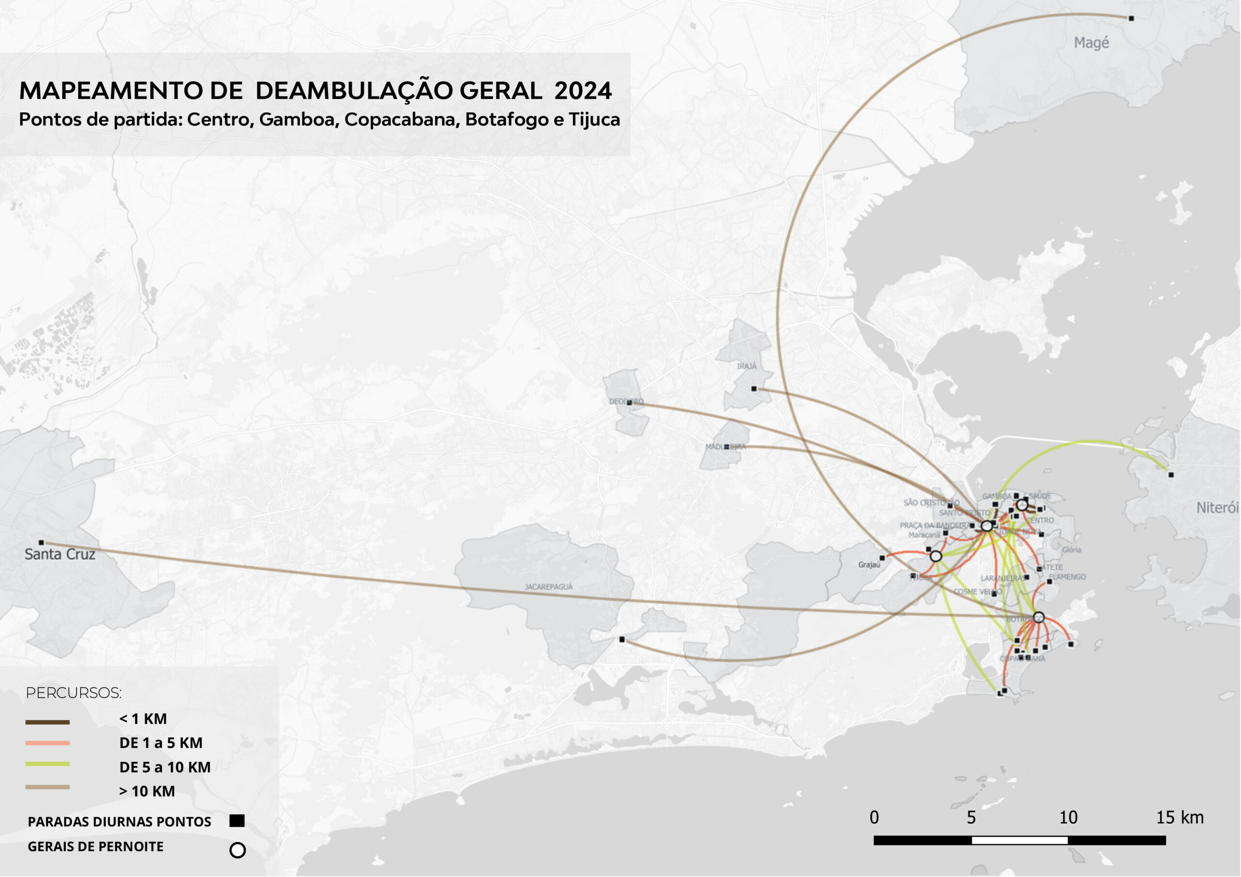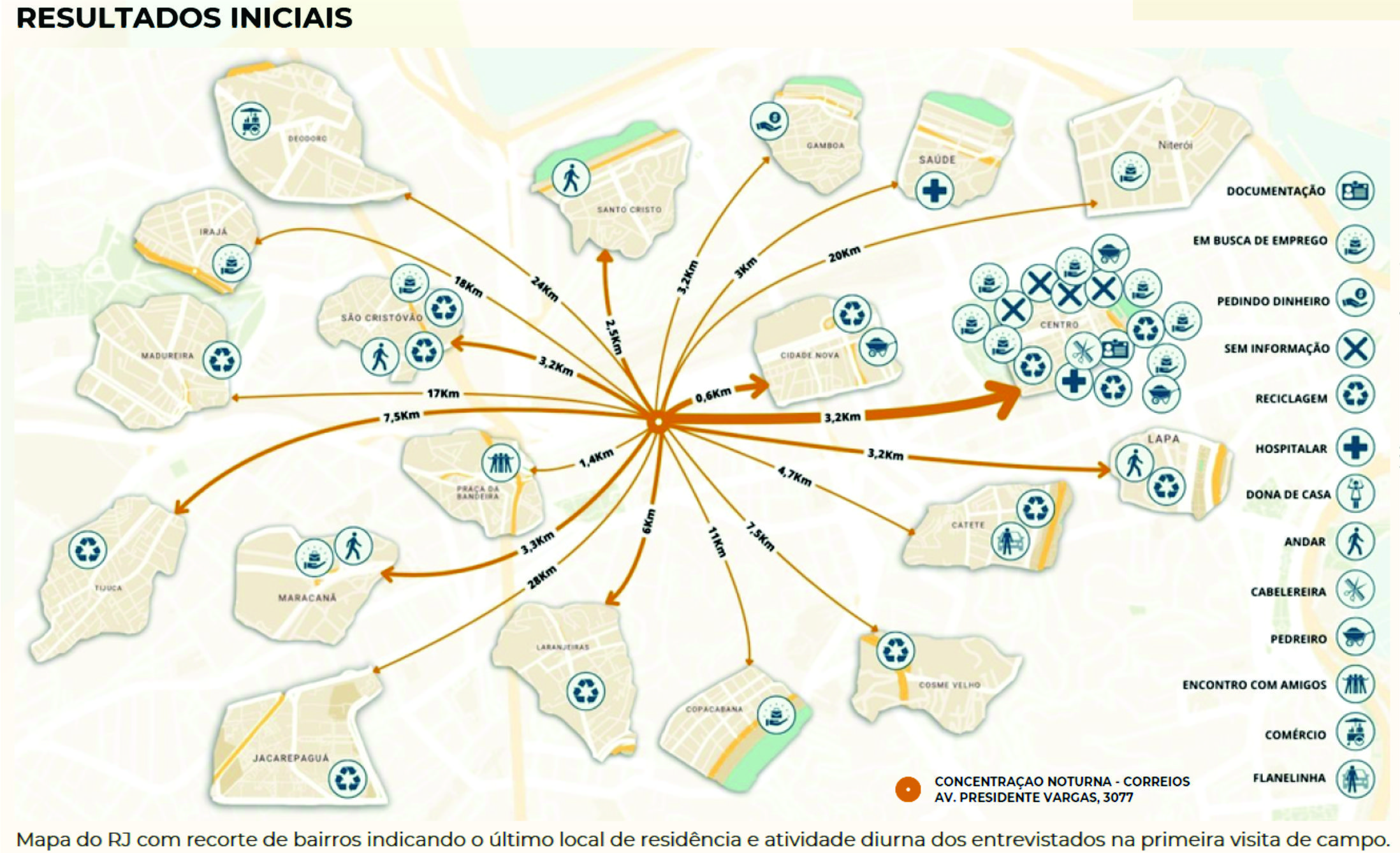 Por esta razão, desde o final de 2023, a pesquisa passou a tratar esses dados como ponto de partida para a análise do contexto espacial contemporâneo da cidade do Rio de Janeiro, diante do aumento expressivo do número de pessoas que vivem nas ruas, sem direito à justiça social. Através do georreferenciamento, e também por meio de abordagem qualitativa, com emprego de entrevista semiestruturada e oferta de alimentação e acolhimento, a equipe busca as informações in situ, em rondas/derivas noturnas realizadas por diversos bairros da capital, e assim são levantados os nomes, tempo de permanência nas ruas, os trajetos que essas pessoas realizam durante o dia na cidade, e o seu papel laboral não formalizado.