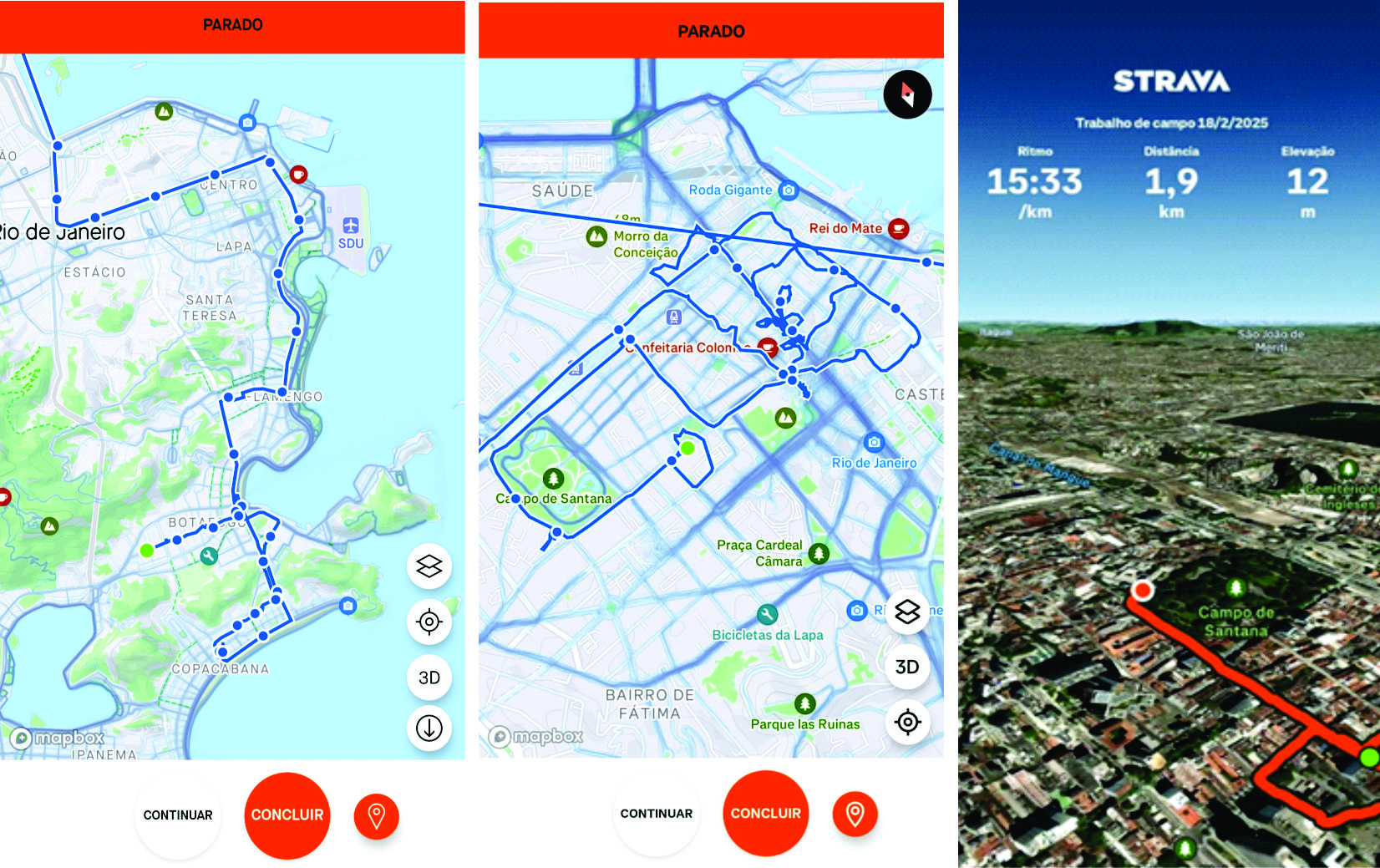 Em cada saída, os pontos onde as pessoas são encontradas são anotados com suas coordenadas no mapa interativo do Google™, o MyMaps, e, posteriormente, no software QGis, cuja licença educacional pertence à UFRJ. Para traçar cada trajeto, utiliza-se o aplicativo Strava, que acompanha o movimento do corpo da coordenadora e da equipe, tanto dentro da van quanto ao longo das ruas, construindo um modelo dinâmico 3D e 2D.