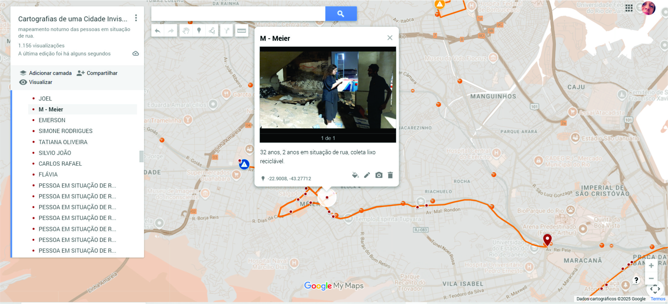 O georreferenciamento em tempo real dos pontos de localização de pessoas em situação de rua tornou as etapas de saídas noturnas muito mais precisas e adequadas. Numa saída noturna, por exemplo, realizada pela região norte do RJ (Méier e Cachambi) em 21/11/2024, o MyMaps mostra exatamente a quantidade de pessoas em cada trajeto analisado, além de informações sensíveis obtidas pelas entrevistas, o que permitiu um incremento em tempo real ao consolidar informações visíveis por todos os pesquisadores ao mesmo tempo e, posteriormente, por outras pessoas.
